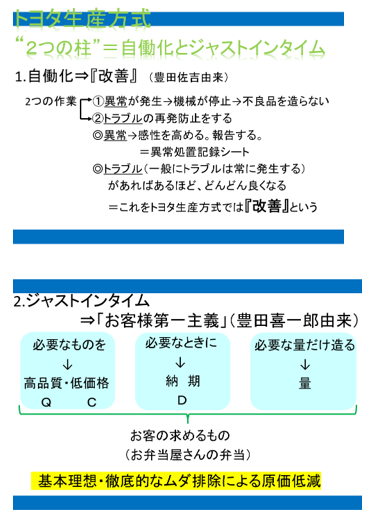 ・もう一つの柱はジャストインタイムですが、ムダを無くして原価低減を目指しています。車の価格は市場相場により企画段階で決まっているので、部品価格(単価)は割り振られて決まってきます。従って、原価低減によってその差である利を追求する事になります。