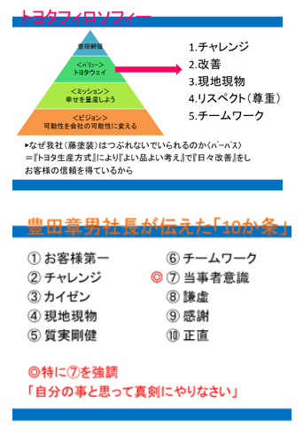 ・トヨタにはトヨタフィロソフィー(トヨタ哲学)というものがあります。ここには当たり前の事があげられています。トヨタフィロソフィーを軸にしてトヨタの社長様が発信された10か条というのがあります。