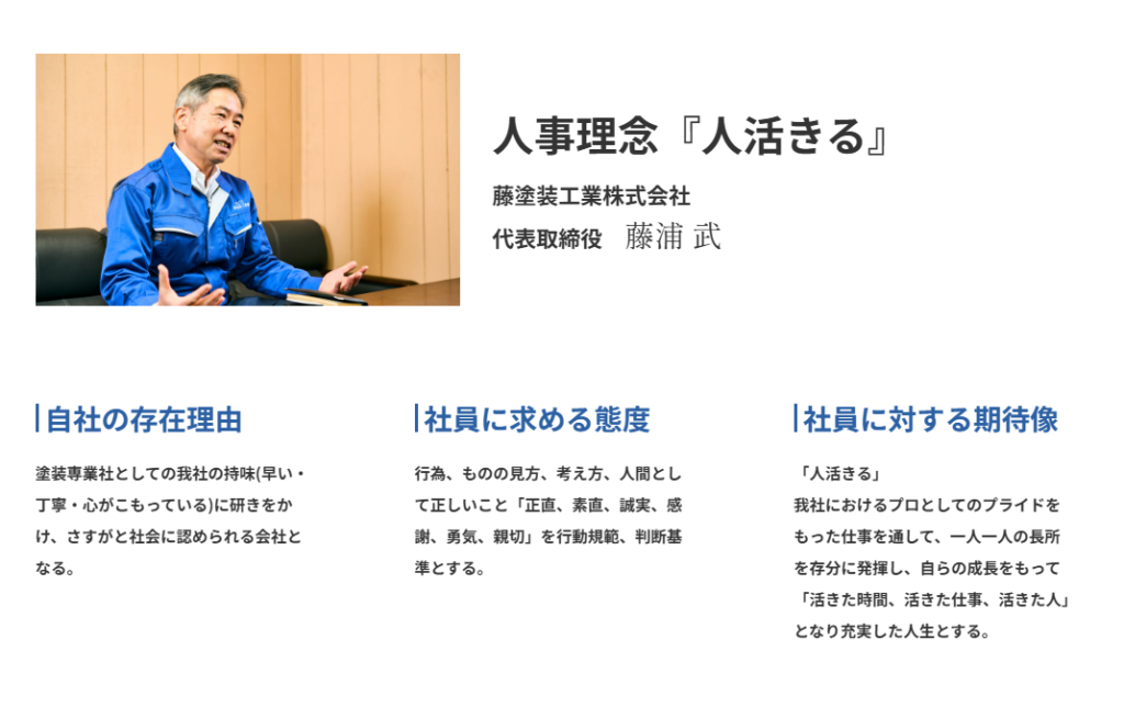 21歳の時、出会った方から、「100社の情報を集めて一冊の本にしていますが、藤塗装さんの経営理念を、そこに載せてみませんか」と言われたことがきっかです。この機会に経営理念をつくろうと思い、本腰を入れて考えました。